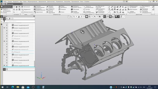 Компас-3D v.20. Сборка ДВС, часть 11.11. Блок двигателя, Нижние площадки крепления гильз и другое.