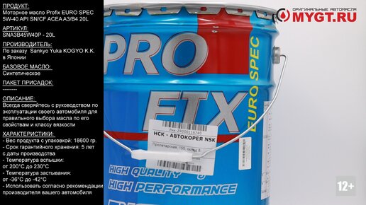Моторное масло Profix EURO SPEC 5W-40 API SN/CF ACEA A3/B4 20L #ANTON_MYGT