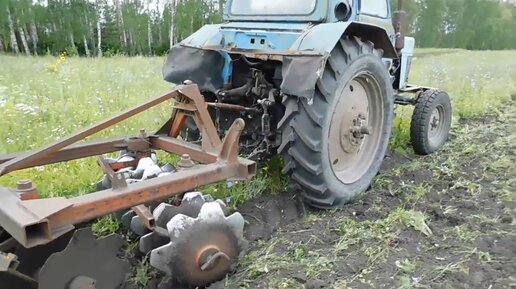 Трактор МТЗ-80 дискует поле самодельной дисковой бороной БДТ!