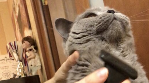 Вычесываю плюшевую шубку британского кота. Процесс долгий и Арсению приходится потерпеть
