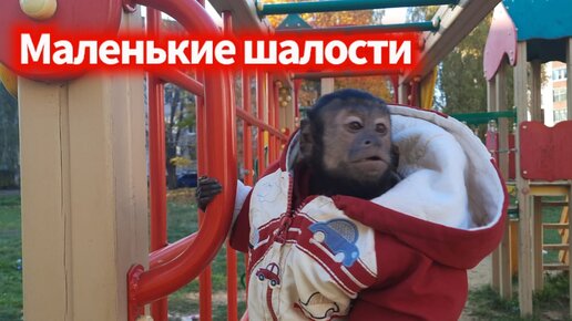 Во что играет маленькая обезьянка на улице, прогулка с домашними животными.