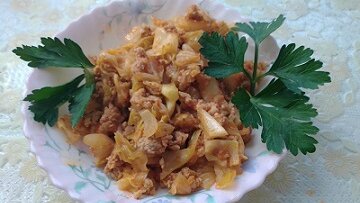 Тушеная свежая капуста с фаршем на сковороде. Простой рецепт.