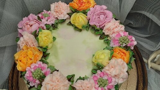 Оформление торта цветами из крема. Гвоздики, пионы, скабиозы, розы.