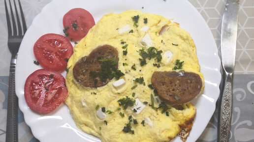 Очень вкусный омлет с феттой беконом и багетом, любимый завтрак сына