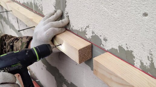 Временный стартовый брусок для первого ряда утеплителя и вырезание Гешек из пенополистирола
