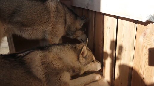 Жизнь стаи хаски. Старшие братья присматривают за младшими щенками , пока мама гуляет.
