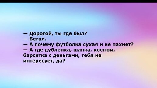 -Дорогой, ты где был? - Бегал - А почему футболка сухая и не пахнет? - А где дубленка, костюм, барсетка.. Анекдоты