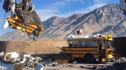 Мощный экскаватор разрушает корабль, здание и автобус.