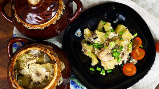 Куриное жаркое в горшочках с грибами и картофелем.