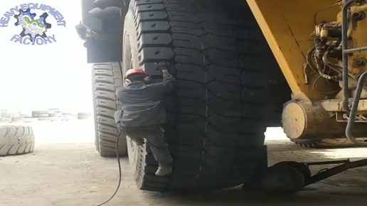 Ремонт шины у карьерного самосвала. Только посмотрите на колесо, которое в 3 раза больше человека.