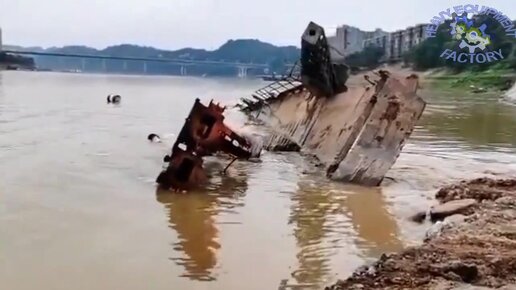 Безумный машинист экскаватора утопил его в реке. Как таких вообще за руль пускают.