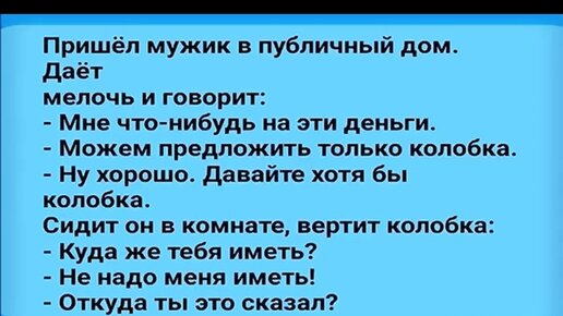 Пришел мужик в публичный дом. Дает мелочи и говорит: - Мне что-нибудь на эти деньги...Анекдот