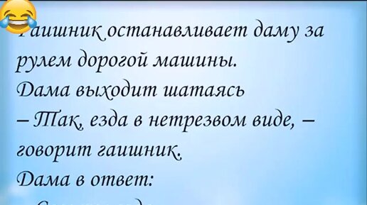 Гаишник останавливает даму за рулем дорогой машины. Дама выходит шатаясь...Анекдот