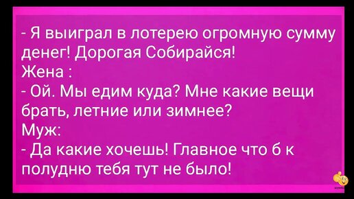 Муж выиграл в лотерее огромную сумму и говорит: - Дорогая, собирайся! - Куда едем? -Куда хочешь, чтобы тебя тут не было. Анекдот