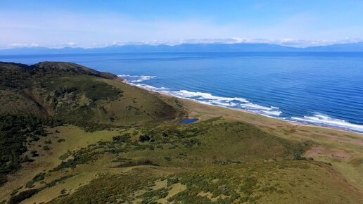 Панорамный вид с высоты птичьего полета на остров Кунашир и озеро Песчанное