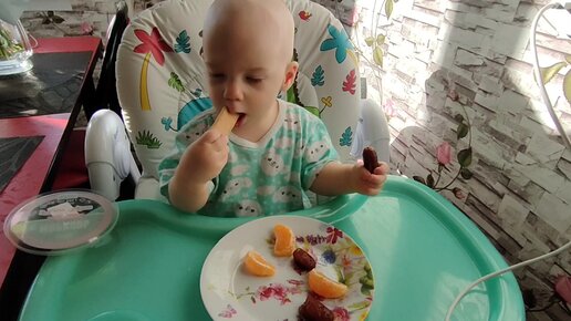 Ужин малыша. Мандарины, финики и печенье.