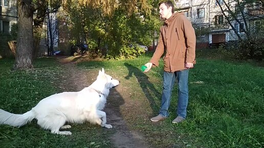 Белая швейцарская овчарка ловит мячик 🥎