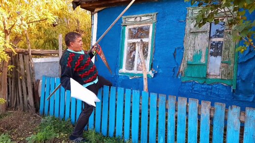 Отец забивает окна плёнкой , подготовка к зиме , что-бы дома было тепло .
