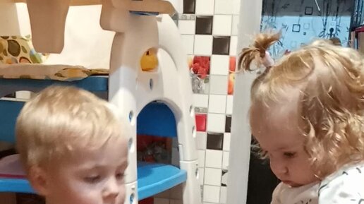 Дети играют с гимнастическим мячом.(10 мес.и 3 года)