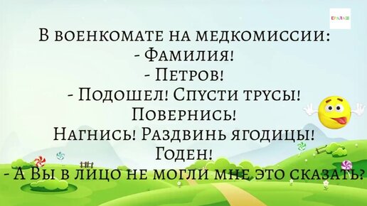 В военкомате на медкомиссии: -Фамилия! -Петров! - Подошел! Спустил трусы! Анекдот