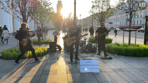 Уличная рок-группа красиво исполнила песню «Районы-кварталы» группы «Звери» на фоне закатного Петербурга