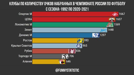 Сколько клубы набрали очков в Чемпионате России по футболу с сезона 1992 по 2020-2021