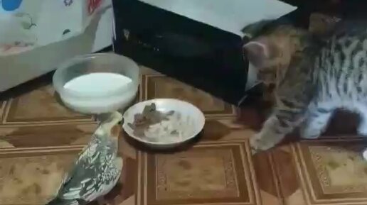 Взрослый попугай и маленький котенок, делят одну миску с едой) 🐈⬛🦜🐈