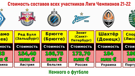 Сравнение стоимости всех команд участников Лиги Чемпионов 2021/22 на групповой стадии