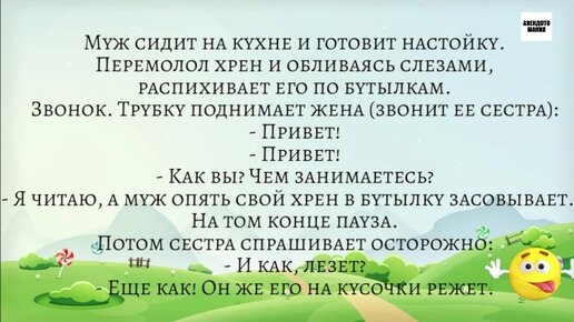 Мужик сидит на кухне и готовит настойку. Звонок. Трубку поднимает жена: - Привет! Анекдот