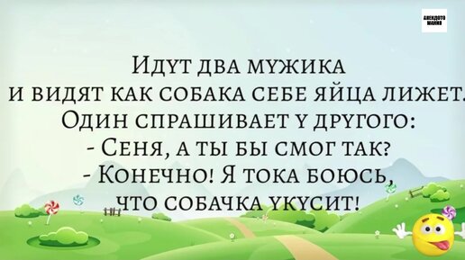 Идут два мужика и видят как собака лижется. Один спрашивает другого: - Сеня, а ты бы так смог? Анекдот