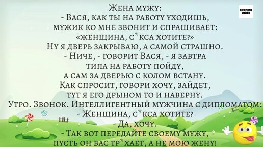 Жена мужу: - Вася, как ты на работу уходишь, мужик ко мне звонит и спрашивает Анекдот