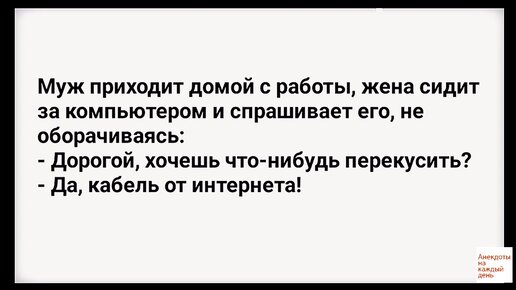 Муж приходит домой с работы, жена сидит за компьютером и спрашивает: - Хочешь перекусить? -Да, кабель интернета! Анекдот