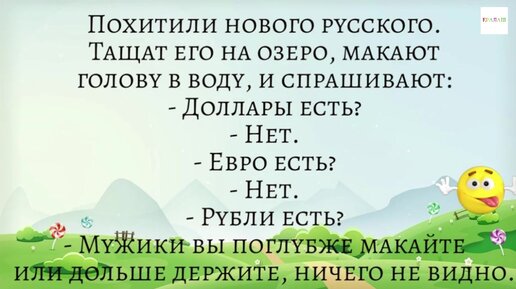 Похитили нового русского. Тащат его на озеро, макают голову в воду, спрашивают: - Доллары есть? Анекдот