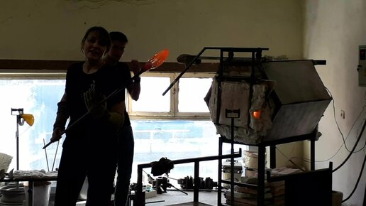 Стеклодув нагревает стекло в печке и создаёт из него красоту