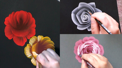 Три способа нарисовать розу красками: жёлтая, розовая и ахроматическая