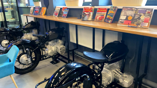 Буфет, где сидят на сидениях мотоциклов вместо стульев