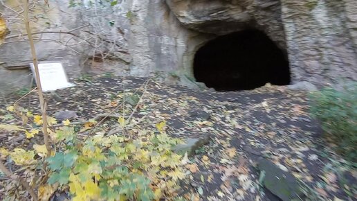 Пещера первобытного человека, теплый осенний день в лесном массиве в горах