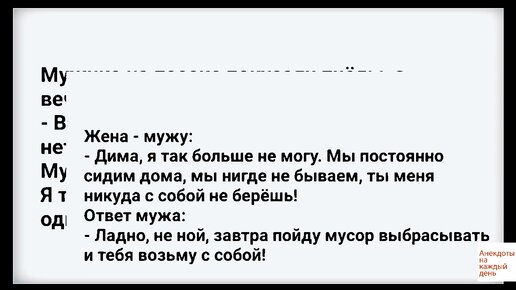 Жена мужу: - Ты меня никуда не берешь! - Не ной, завтра мусор пойду выбрасывать, с собой возьму. Анекдот