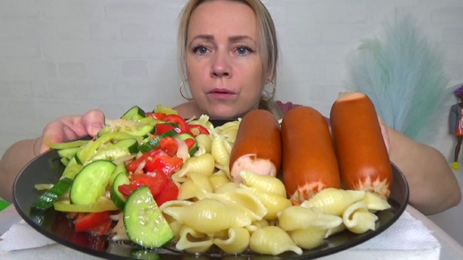 Мукбанг макароны с сардельками и салат овощной .Еда на камеру.
