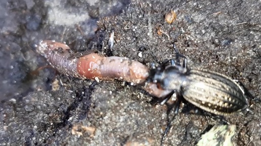 Хищное насекомое поедает свою жертву. Жужелица
