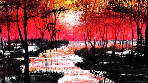 Как нарисовать закат легко. Рисуем закат в лесу. Рисуем реку. Осенний пейзаж гуашью.