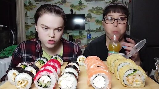 Мукбанг | Заказали роллы, очень огромные и вкусные. Сегодня прям обжор. Пожрем и почавкаем
