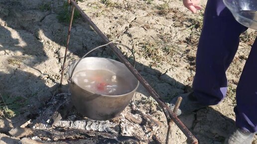 Уха в казане на костре на реке