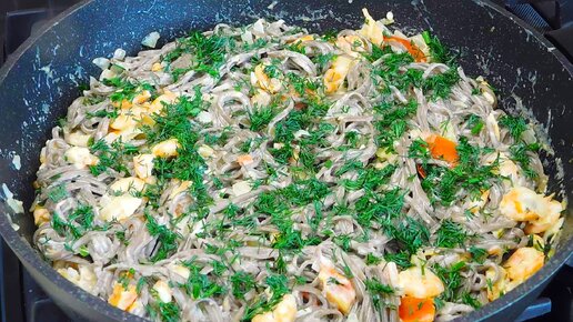 Гречневая лапша с креветками и овощами - вкусный обед за 15 минут.