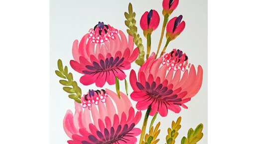 Темно-розовые цветы. Декоративное рисование плоской кистью №6.