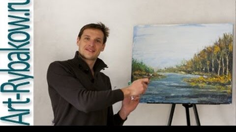 Полный УРОК: Как нарисовать солнечную картину маслом на озере осенью.