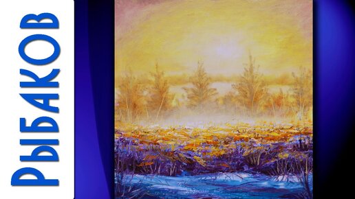 Туманный рассвет над замерзшим озером - картина маслом. Рыбаков.
