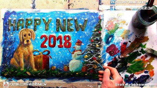 Ч2 Рисуем новогоднюю открытку: символ 2018 желтый пес НОВЫЙ ГОД и веселый снеговик ★ Валерий Рыбаков