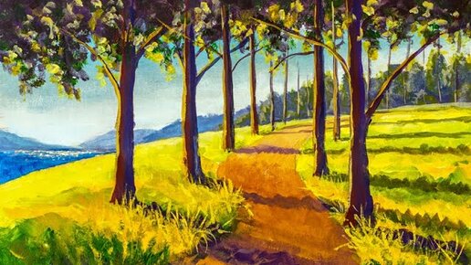 Как нарисовать солнечный пейзаж акрилом. Валерий Рыбаков.