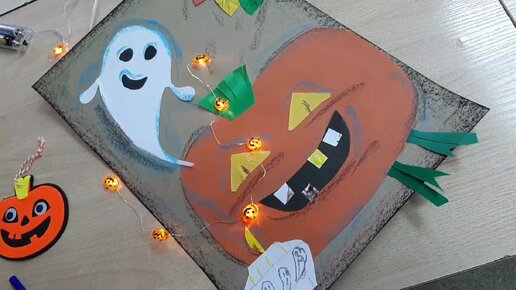 Катя показывает как надо сделать аппликацию на хеллоуин